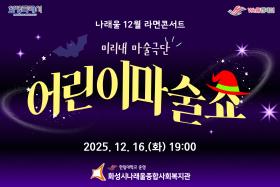 안녕하세요?2025년 한해 마무리 잘 하고 계신지요?나래울에서는 12월 16일 화요일 특별한 공연이 진행되었습니다.12월 라면콘서트 "미리내 마술극단"의 "어린이 마술쇼"입니다.154명의 어린이와 보호자분들이 공연 관람을 위해나래울 지하 1층 대강당을 찾아오셨습니다.미..